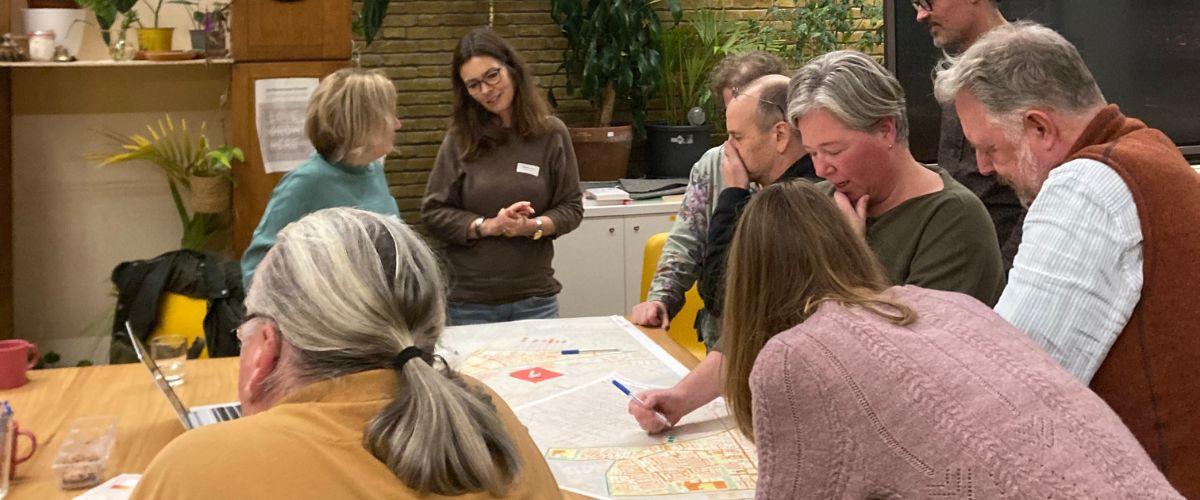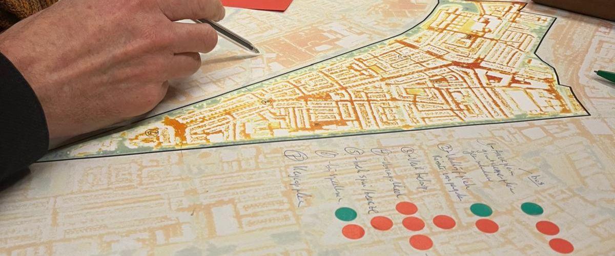 In de eerste groep werkten bewoners met wijkkaarten van de vier buurten. Op basis van hun eigen ervaring en de gepresenteerde hittekaarten markeerden ze plekken waar pergola’s of andere schaduwmakers veel zouden kunnen betekenen, bijvoorbeeld: